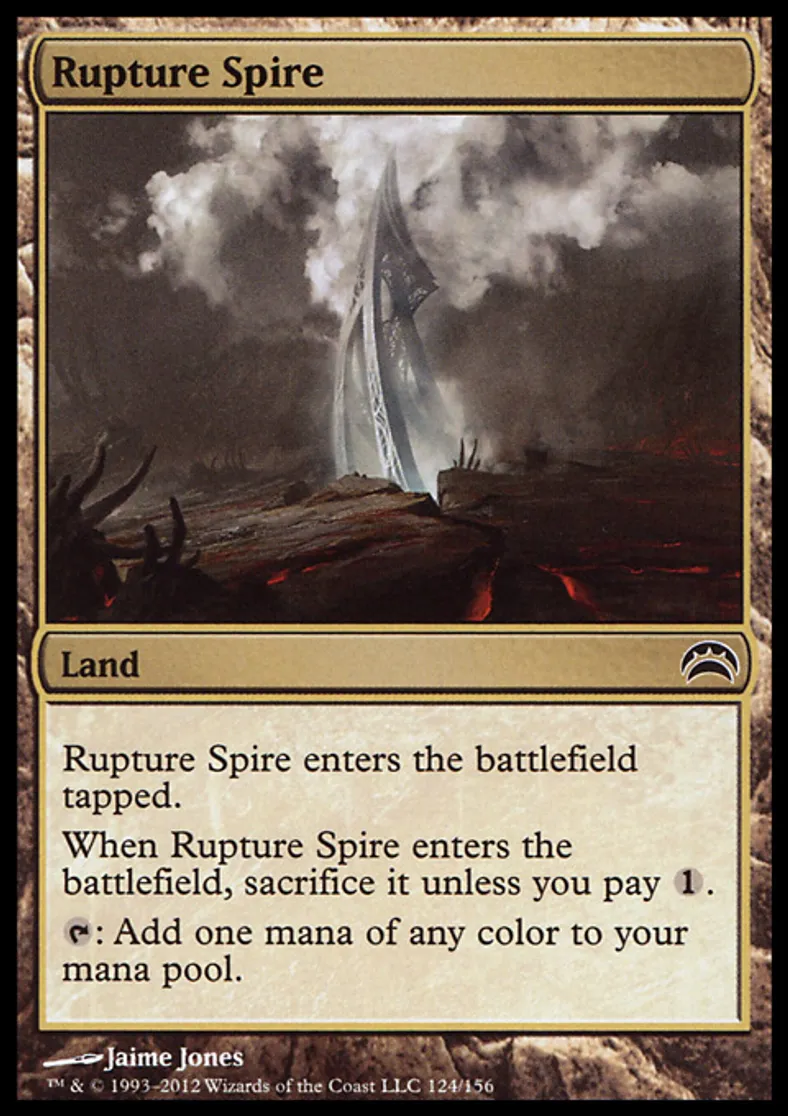 | Oracle Text | Rupture Spire enters the battlefield tapped. When Rupture Spire enters the battlefield, sacrifice it unless you pay {{1}}. {{t}}: Add one mana of any color to your mana pool. | ||