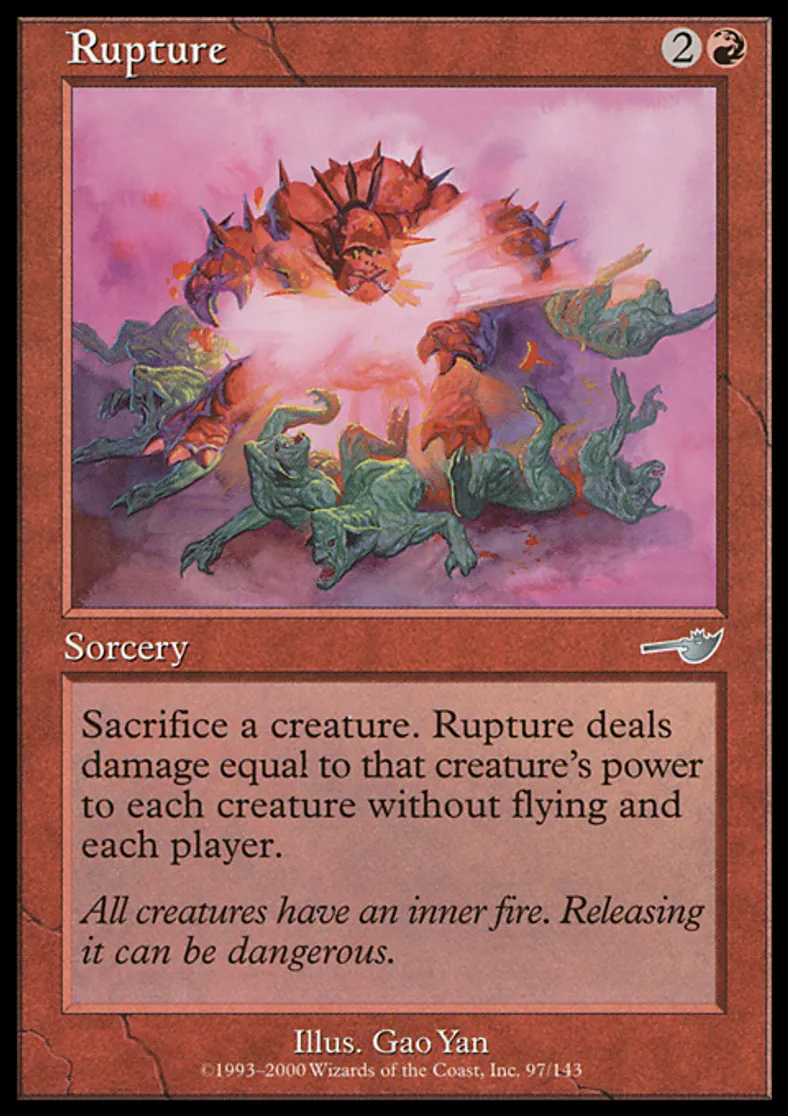 | Oracle Text | Sacrifice a creature. Rupture deals damage equal to that creature's power to each creature without flying and each player. | ||