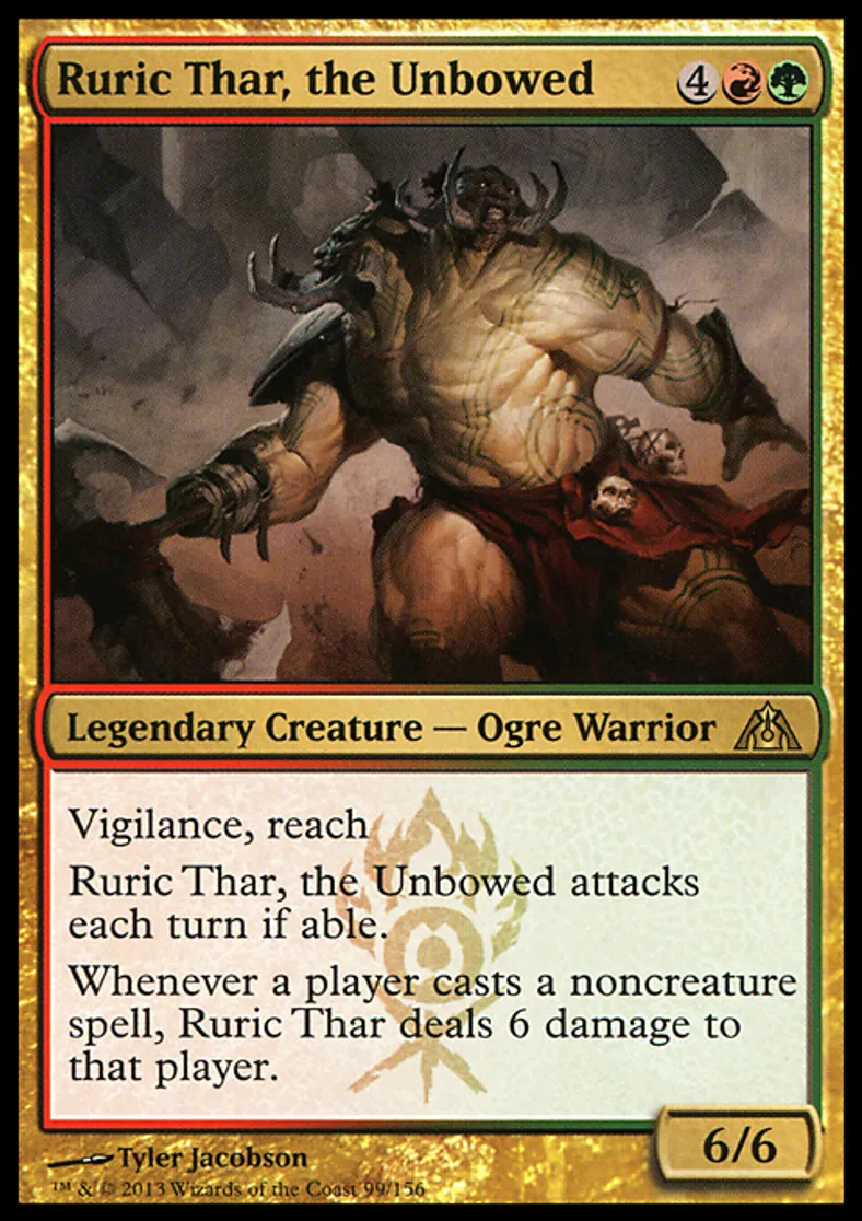 | Oracle Text | Vigilance, reach Ruric Thar, the Unbowed attacks each turn if able. Whenever a player casts a noncreature spell, Ruric Thar deals 6 damage to that player. | ||