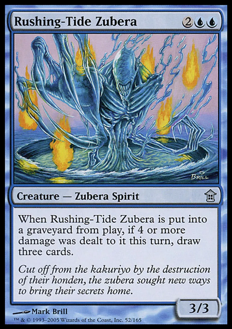 | Oracle Text | When Rushing-Tide Zubera dies, if 4 or more damage was dealt to it this turn, draw three cards. | ||