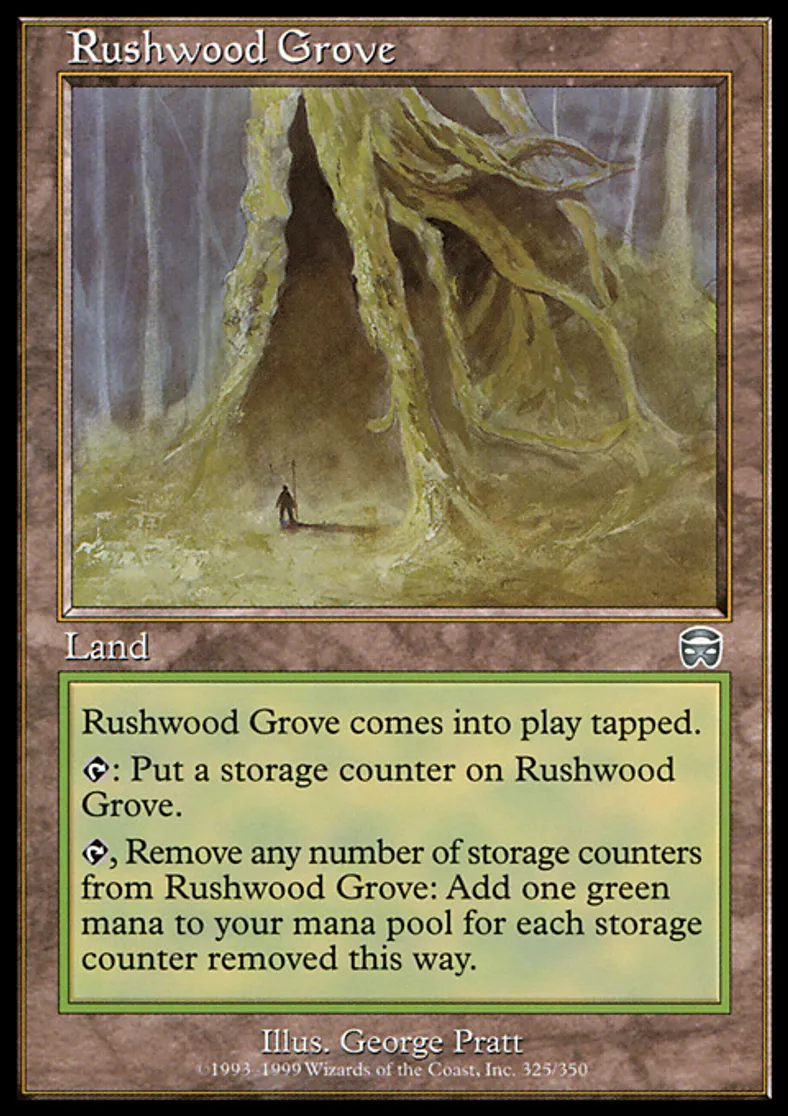 | Oracle Text | Rushwood Grove enters the battlefield tapped. {{t}}: Put a storage counter on Rushwood Grove. {{t}}, Remove any number of storage counters from Rushwood Grove: Add {{g}} to your mana pool for each storage counter removed this way. | ||