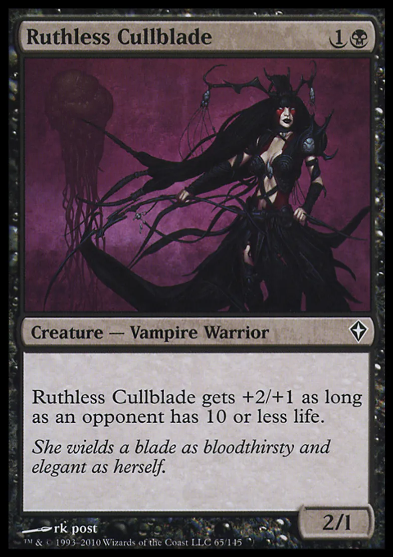 | Oracle Text | Ruthless Cullblade gets +2/+1 as long as an opponent has 10 or less life. | ||