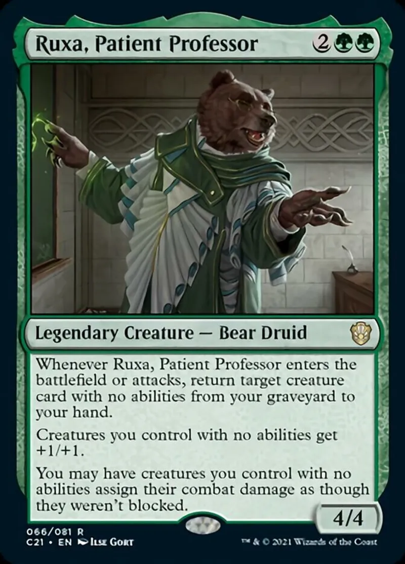| Oracle Text | Whenever Ruxa, Patient Professor enters the battlefield or attacks, return target creature card with no abilities from your graveyard to your hand.