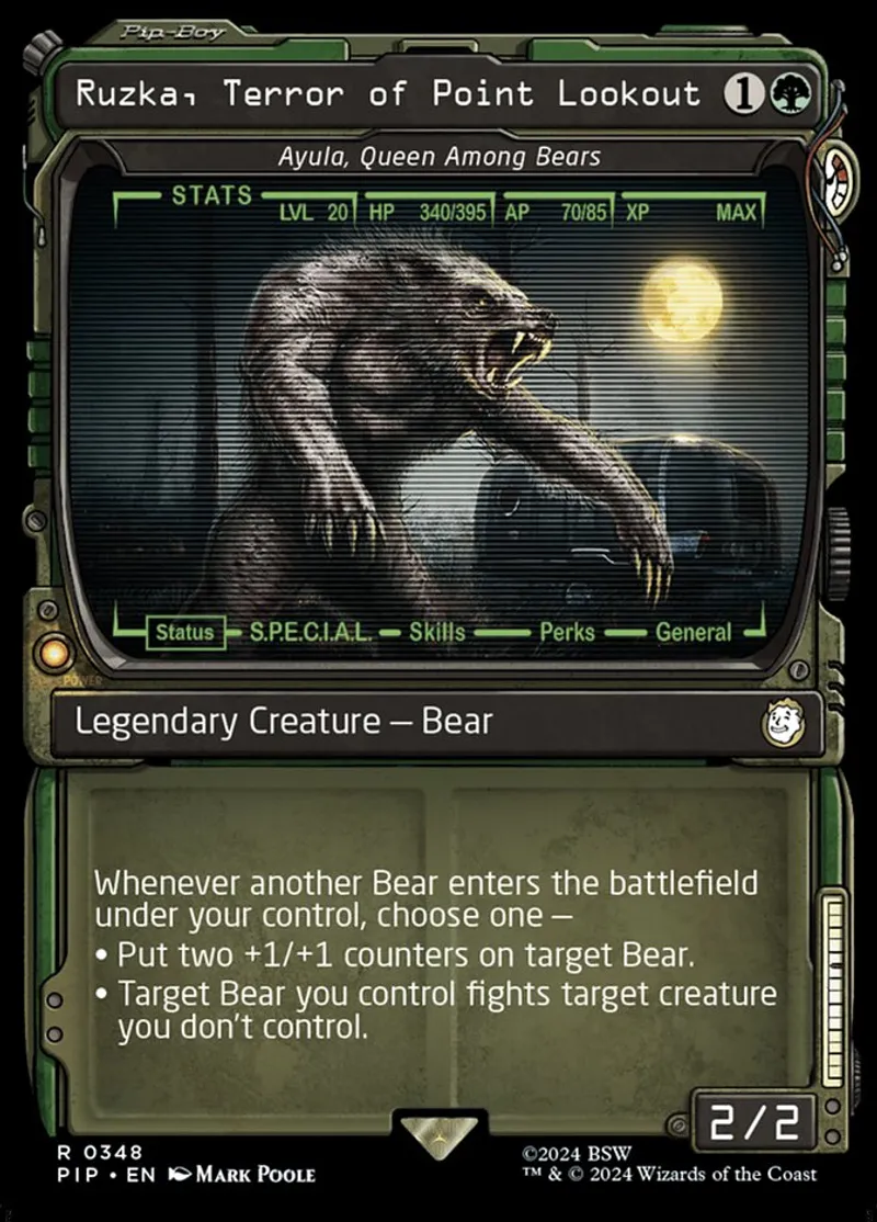 Magic: the Gathering (mtg) rare Legendary Creature — Bear Ruzka, Terror of Point Lookout - Ayula, Queen Among Bears from Universes Beyond: Fallout (pip) last updated 2026-02-24 14:59:02