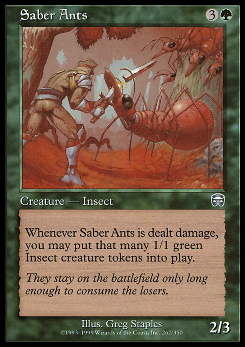 | Oracle Text | Whenever Saber Ants is dealt damage, you may put that many 1/1 green Insect creature tokens onto the battlefield. | ||