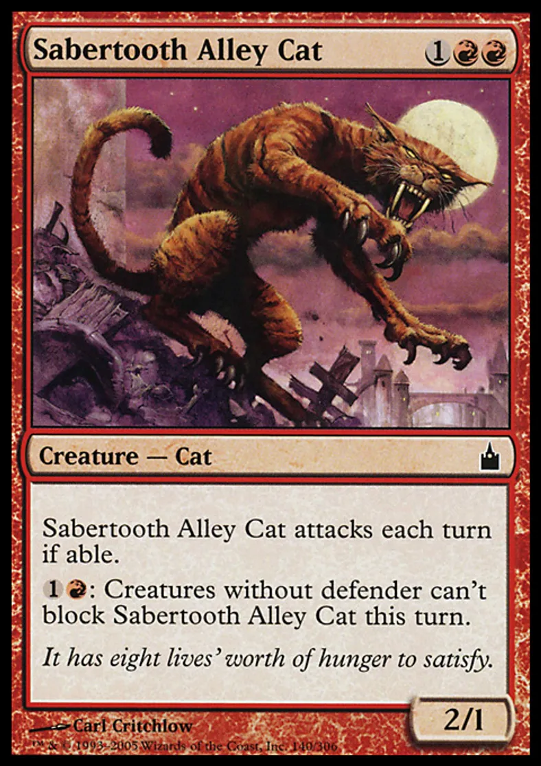 | Oracle Text | Sabertooth Alley Cat attacks each turn if able. {{1}}{{r}}: Creatures without defender can't block Sabertooth Alley Cat this turn. | ||