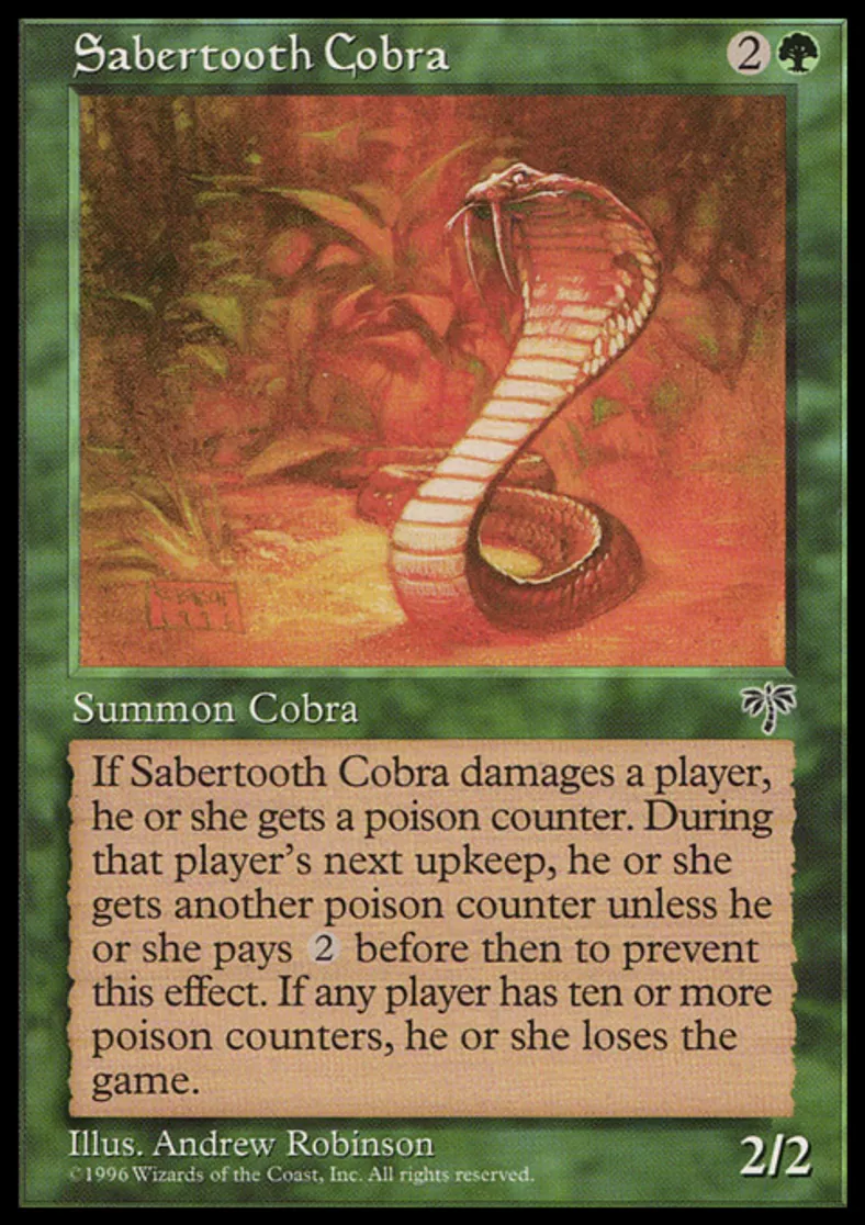| Oracle Text | Whenever Sabertooth Cobra deals damage to a player, he or she gets a poison counter. That player gets another poison counter at the beginning of his or her next upkeep unless he or she pays {{2}} before that turn. (A player with ten or more poison counters loses the game.) | ||