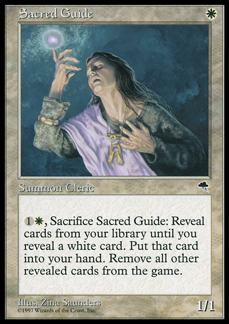 | Oracle Text | {{1}}{{w}}, Sacrifice Sacred Guide: Reveal cards from the top of your library until you reveal a white card. Put that card into your hand and exile all other cards revealed this way. | ||