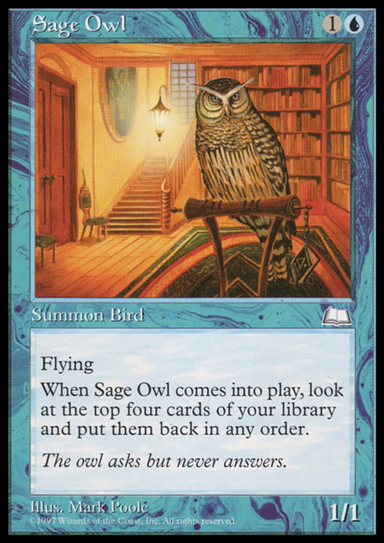 | Oracle Text | Flying When Sage Owl enters the battlefield, look at the top four cards of your library, then put them back in any order. | ||