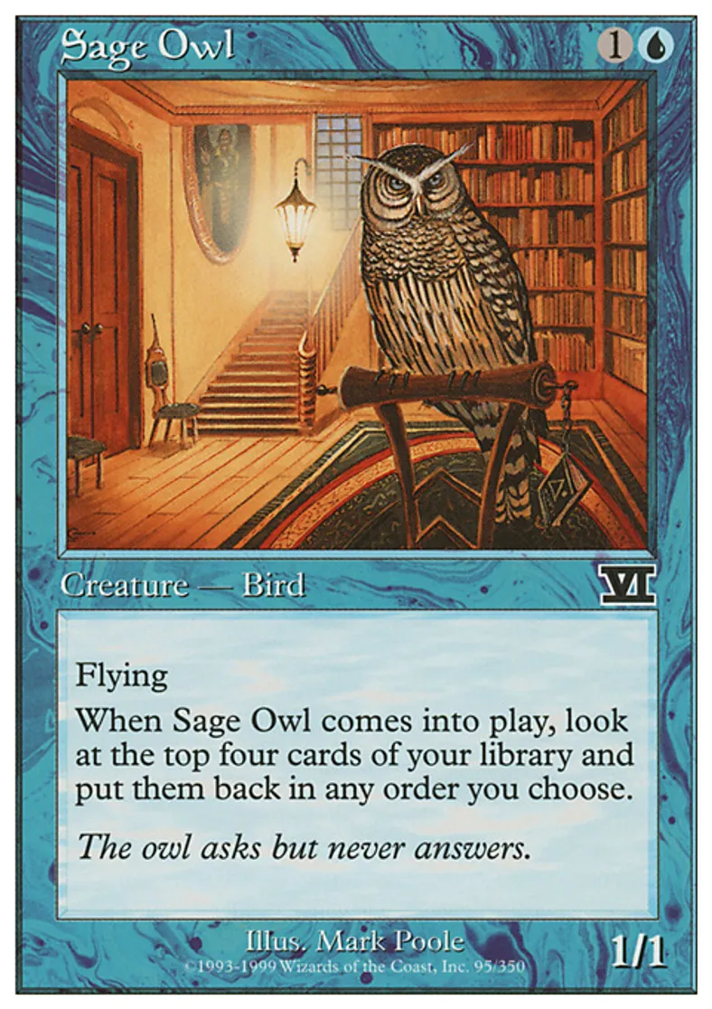 | Oracle Text | Flying When Sage Owl enters the battlefield, look at the top four cards of your library, then put them back in any order. | ||