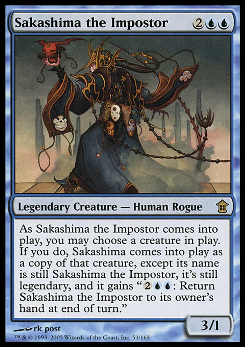| Oracle Text | You may have Sakashima the Impostor enter the battlefield as a copy of any creature on the battlefield, except its name is still Sakashima the Impostor, it's legendary in addition to its other types, and it gains "{{2}}{{u}}{{u}}: Return Sakashima the Impostor to its owner's hand at the beginning of the next end step." | ||