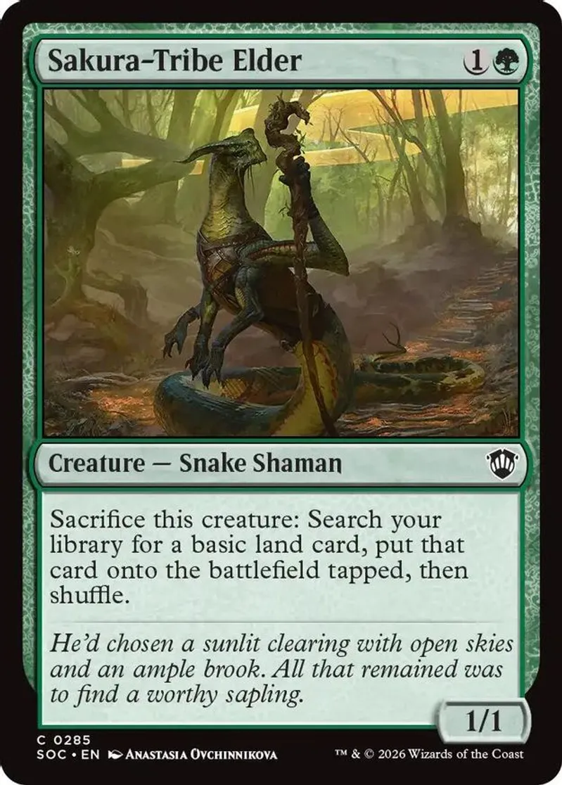 Magic: the Gathering (mtg) Common creature — snake shaman Sakura-Tribe Elder from Commander: Secrets of Strixhaven (SOC) last updated 2026-04-17 00:26:10