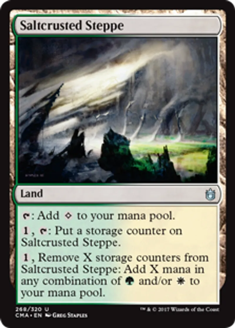 | Oracle Text | {{t}}: Add {{Colorless}} to your mana pool. {{1}}, {{t}}: Put a storage counter on Saltcrusted Steppe. {{1}}, Remove X storage counters from Saltcrusted Steppe: Add X mana in any combination of {{g}} and/or {{w}} to your mana pool. | ||