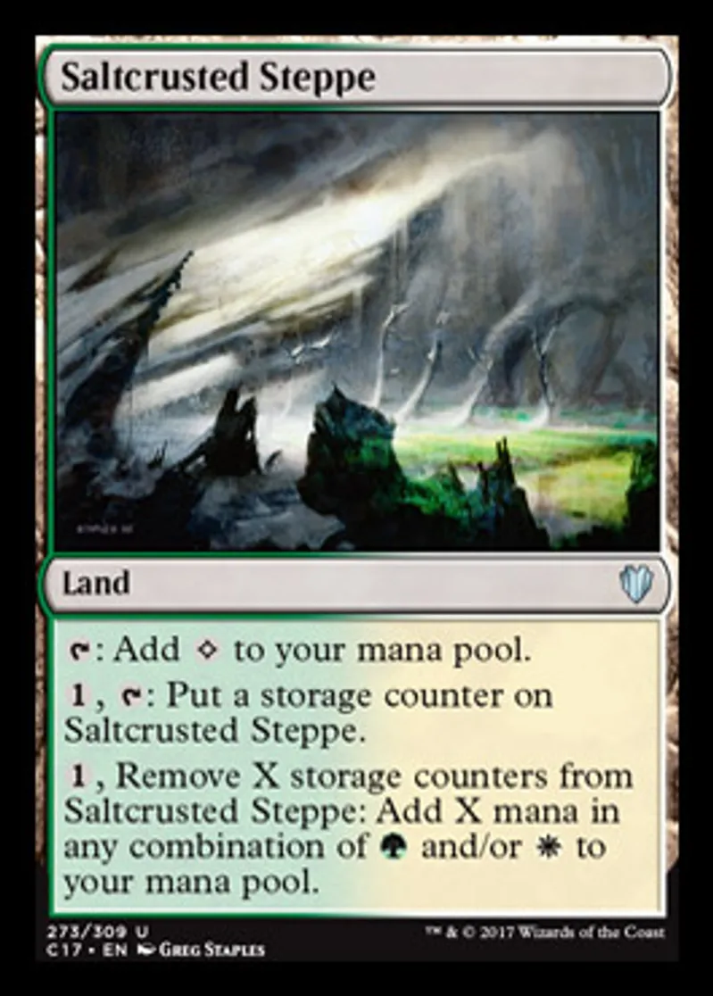 | Oracle Text | {{t}}: Add {{Colorless}} to your mana pool. {{1}}, {{t}}: Put a storage counter on Saltcrusted Steppe. {{1}}, Remove X storage counters from Saltcrusted Steppe: Add X mana in any combination of {{g}} and/or {{w}} to your mana pool. | ||
