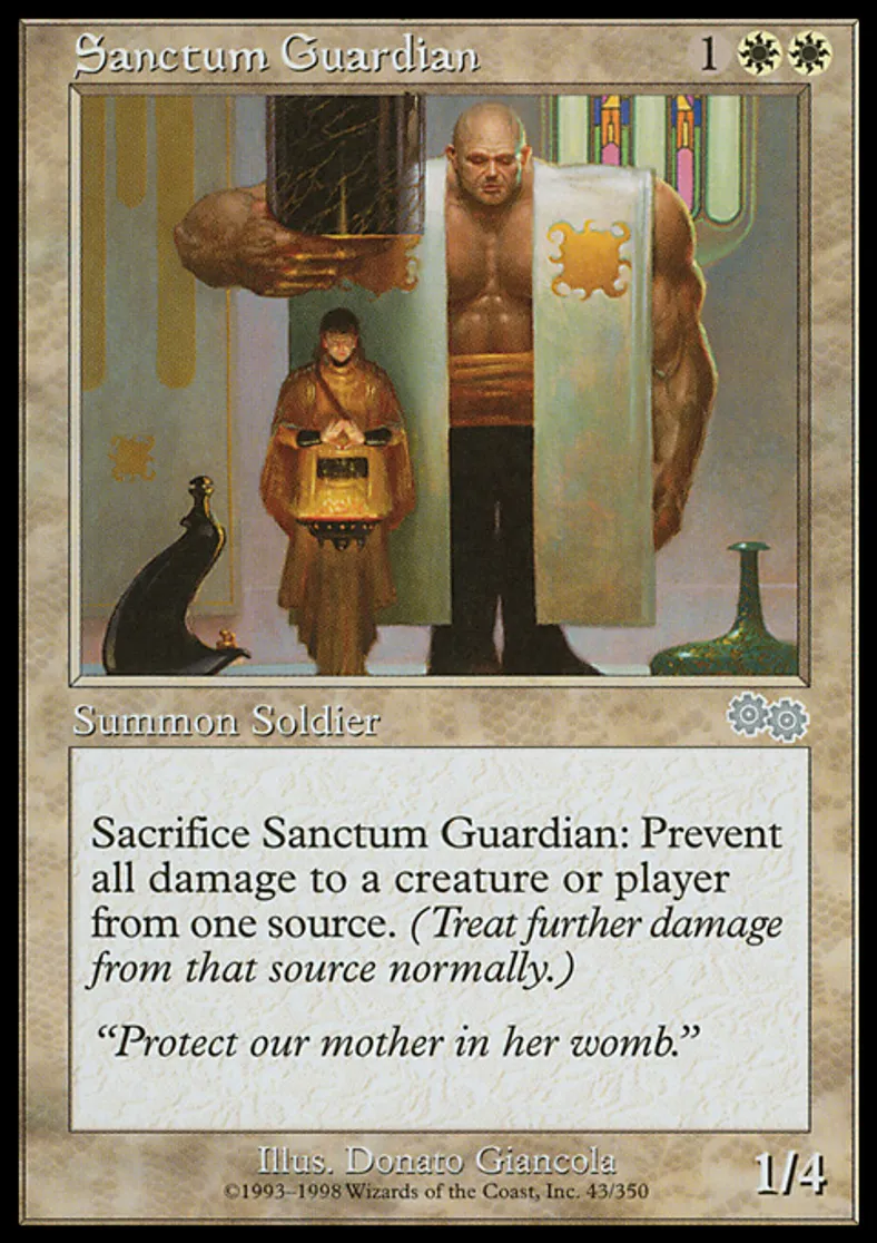 | Oracle Text | Sacrifice Sanctum Guardian: The next time a source of your choice would deal damage to target creature or player this turn, prevent that damage. | ||