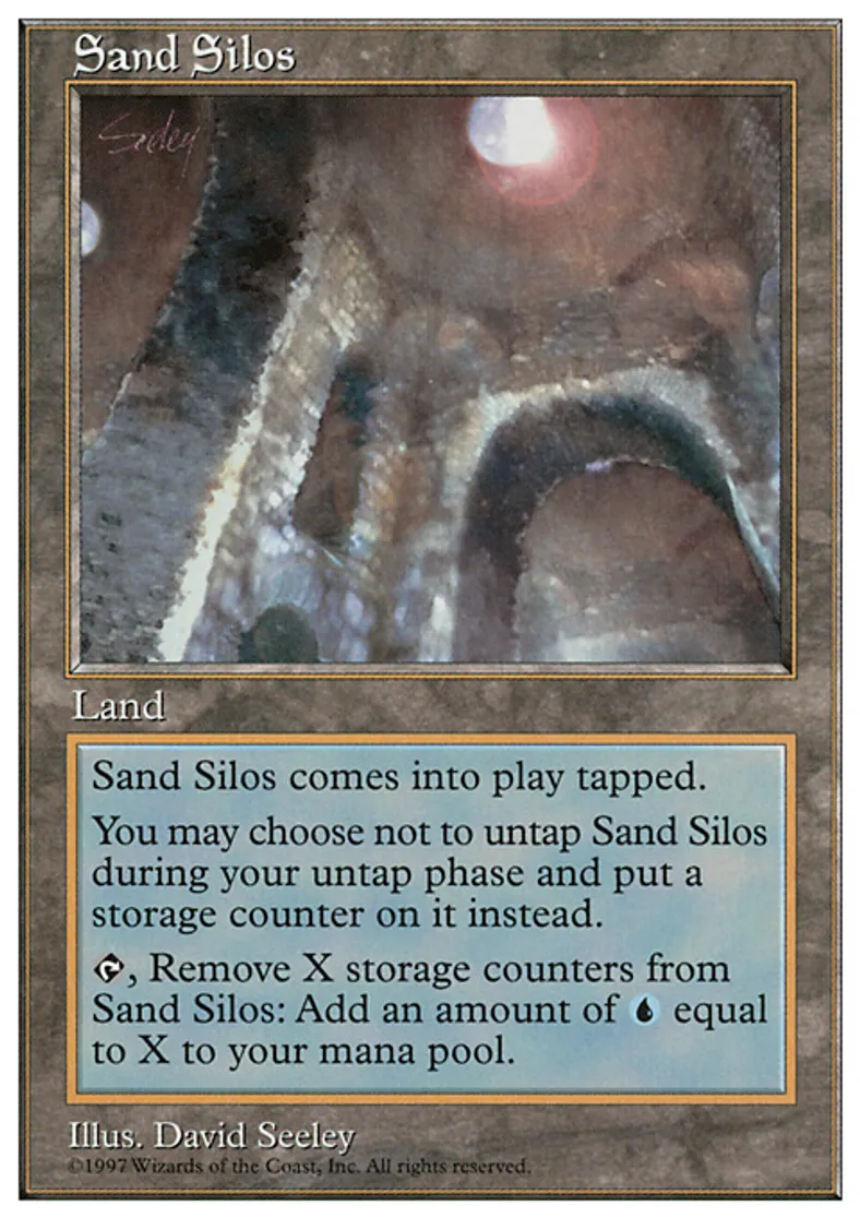 | Oracle Text | Sand Silos enters the battlefield tapped. You may choose not to untap Sand Silos during your untap step. At the beginning of your upkeep, if Sand Silos is tapped, put a storage counter on it. {{t}}, Remove any number of storage counters from Sand Silos: Add {{u}} to your mana pool for each storage counter removed this way. | ||