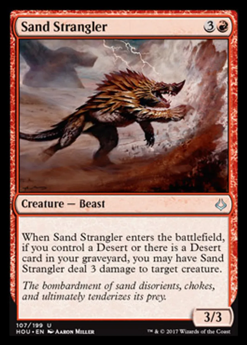 | Oracle Text | When Sand Strangler enters the battlefield, if you control a Desert or there is a Desert card in your graveyard, you may have Sand Strangler deal 3 damage to target creature. | ||