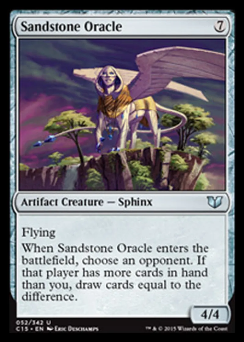 | Oracle Text | Flying When Sandstone Oracle enters the battlefield, choose an opponent. If that player has more cards in hand than you, draw cards equal to the difference. | ||