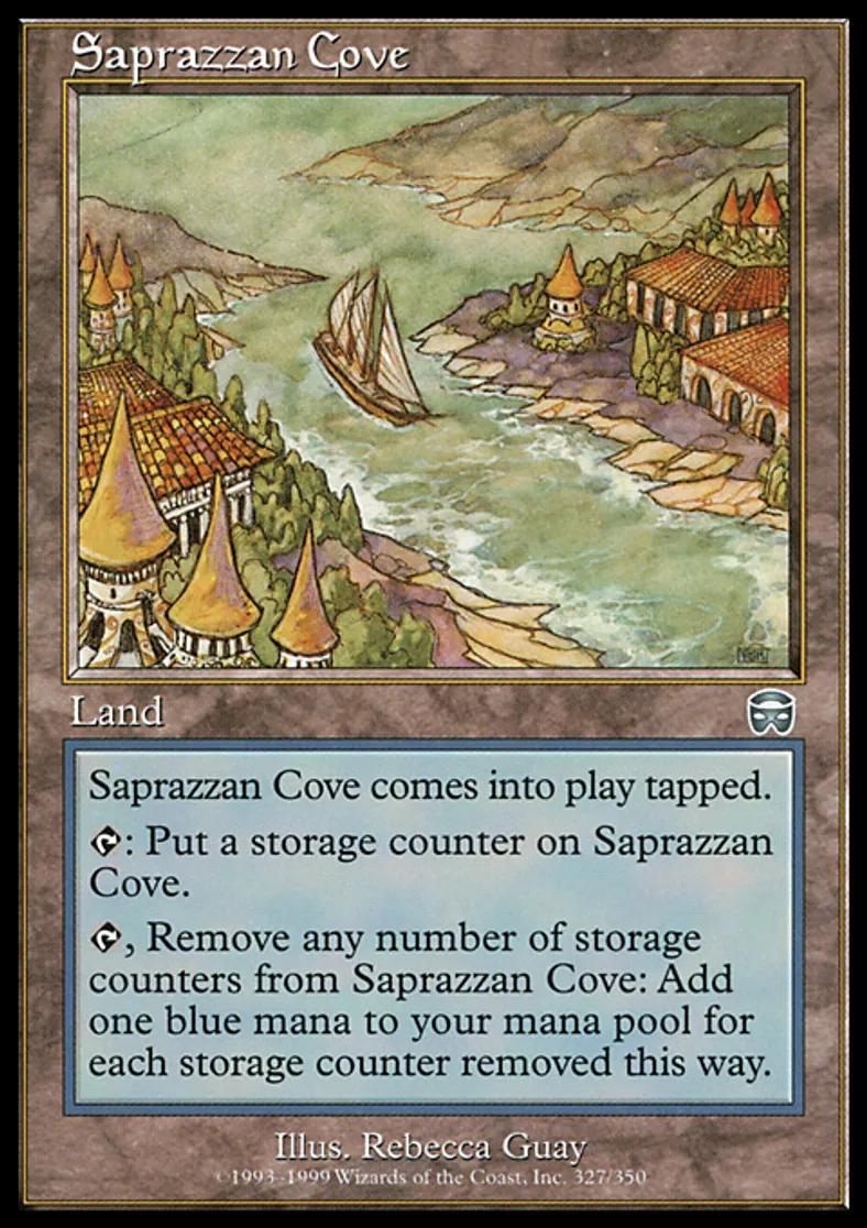 | Oracle Text | Saprazzan Cove enters the battlefield tapped. {{t}}: Put a storage counter on Saprazzan Cove. {{t}}, Remove any number of storage counters from Saprazzan Cove: Add {{u}} to your mana pool for each storage counter removed this way. | ||