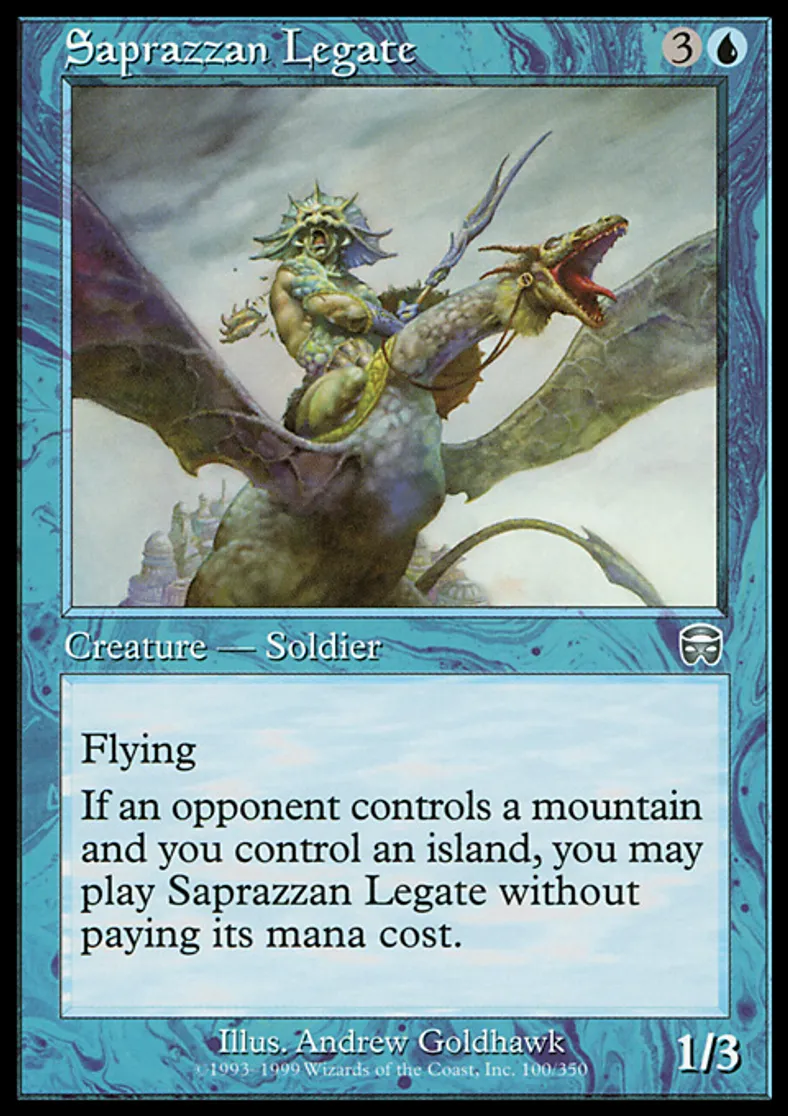 | Oracle Text | Flying If an opponent controls a Mountain and you control an Island, you may cast Saprazzan Legate without paying its mana cost. | ||