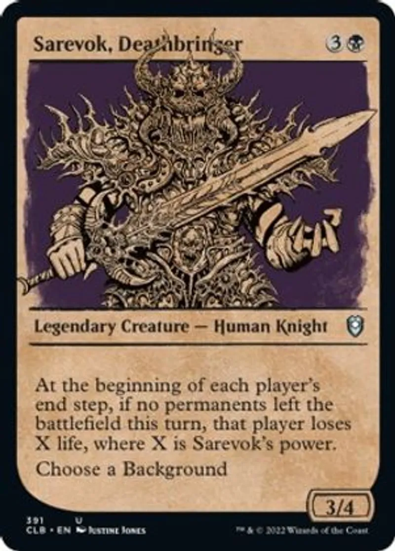 Magic: the Gathering (mtg) Uncommon Legendary Creature — Human Knight Sarevok, Deathbringer from Commander Legends: Battle for Baldur's Gate (CLB) last updated 2026-02-21 16:07:35
