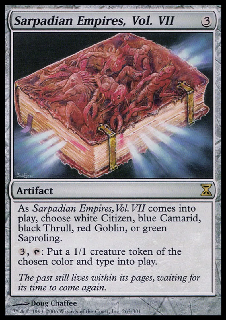 | Oracle Text | As Sarpadian Empires, Vol. VII enters the battlefield, choose white Citizen, blue Camarid, black Thrull, red Goblin, or green Saproling. {{3}}, {{t}}: Put a 1/1 creature token of the chosen color and type onto the battlefield. | ||