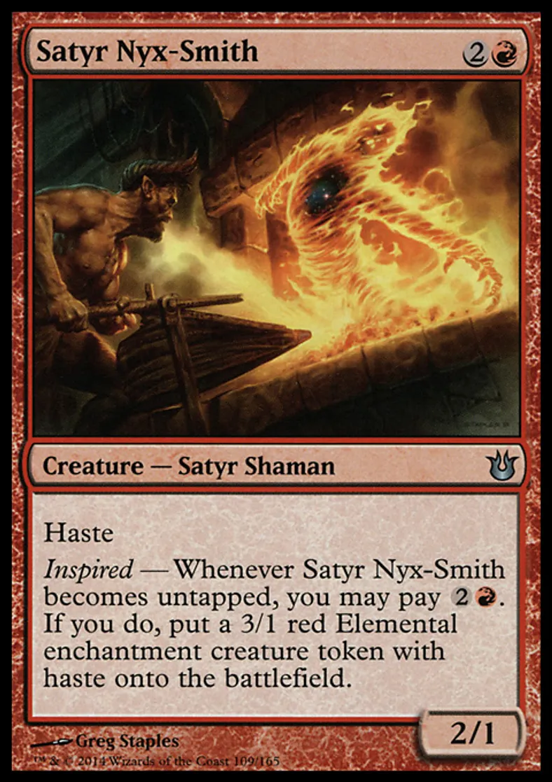 | Oracle Text | Haste Inspired — Whenever Satyr Nyx-Smith becomes untapped, you may pay {{2}}{{r}}. If you do, put a 3/1 red Elemental enchantment creature token with haste onto the battlefield. | ||