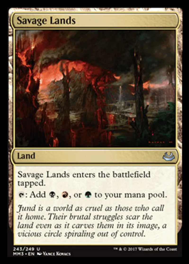 | Oracle Text | Savage Lands enters the battlefield tapped. {{t}}: Add {{b}}, {{r}}, or {{g}} to your mana pool. | ||