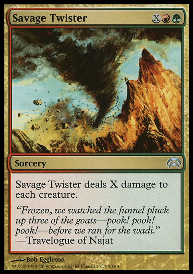 | Oracle Text | Savage Twister deals X damage to each creature. | ||