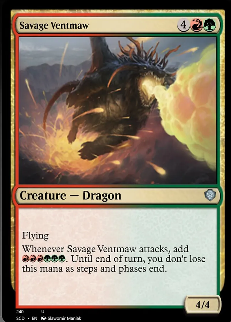 Whenever Savage Ventmaw attacks, add {R}{R}{R}{G}{G}{G}. Until end of turn, you don't lose this mana as steps and phases end. | ||