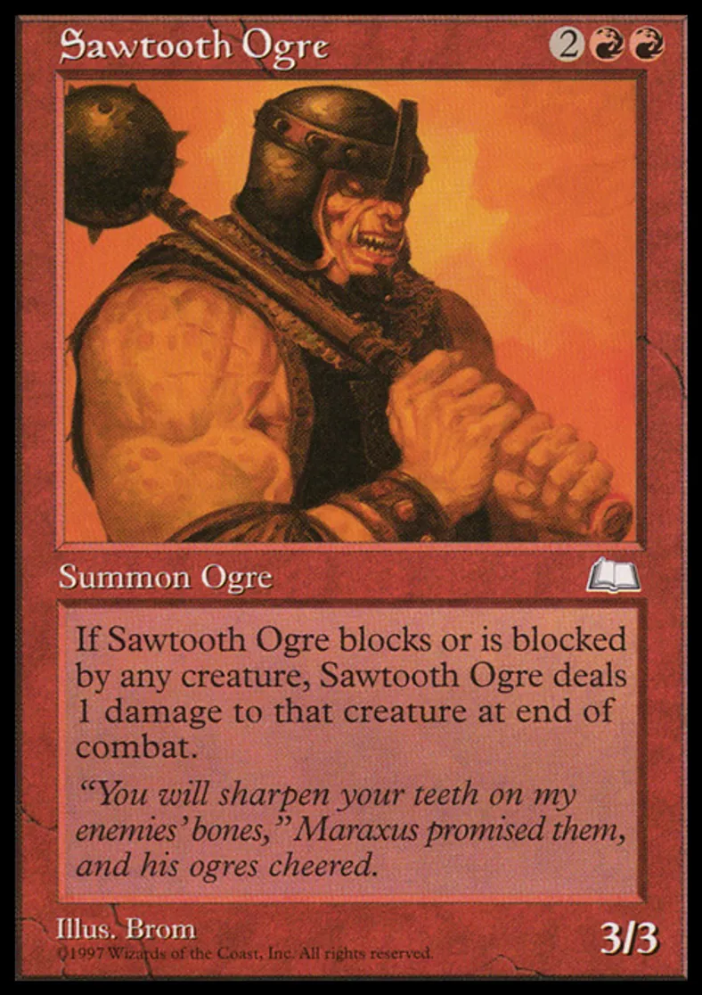 | Oracle Text | Whenever Sawtooth Ogre blocks or becomes blocked by a creature, Sawtooth Ogre deals 1 damage to that creature at end of combat. | ||