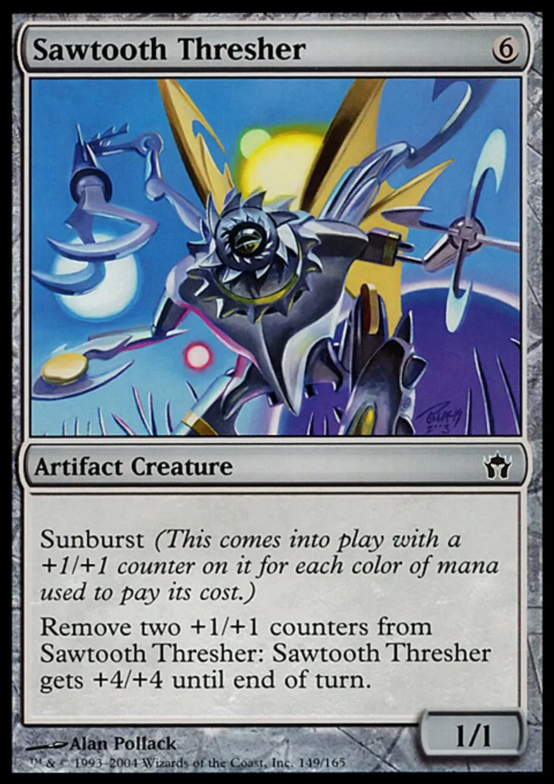 | Oracle Text | Sunburst (This enters the battlefield with a +1/+1 counter on it for each color of mana spent to cast it.) Remove two +1/+1 counters from Sawtooth Thresher: Sawtooth Thresher gets +4/+4 until end of turn. | ||