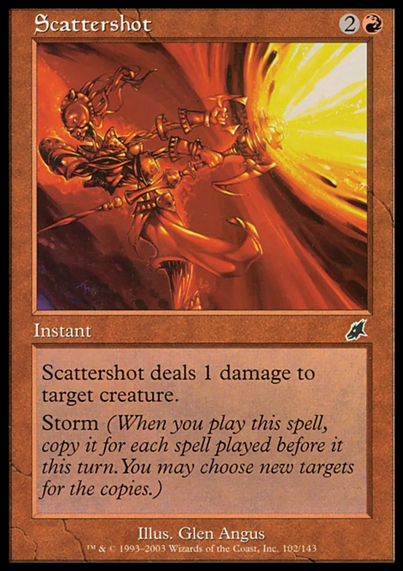 | Oracle Text | Scattershot deals 1 damage to target creature. Storm (When you cast this spell, copy it for each spell cast before it this turn. You may choose new targets for the copies.) | ||