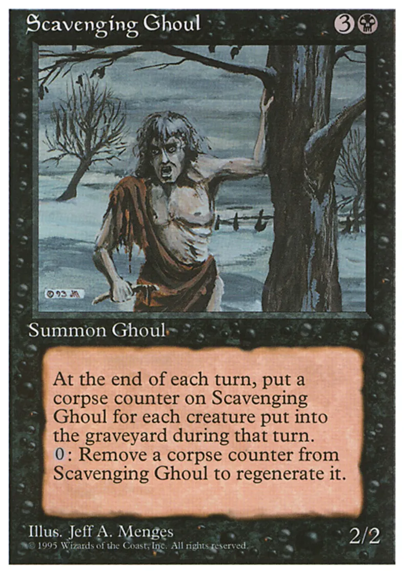 | Oracle Text | At the beginning of each end step, put a corpse counter on Scavenging Ghoul for each creature that died this turn. Remove a corpse counter from Scavenging Ghoul: Regenerate Scavenging Ghoul. | ||