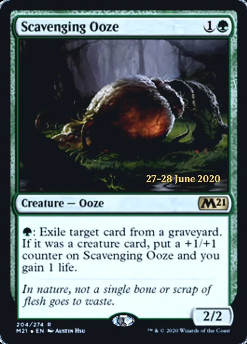 | Oracle Text | {{g}}: Exile target card from a graveyard. If it was a creature card, put a +1/+1 counter on Scavenging Ooze and you gain 1 life. | ||