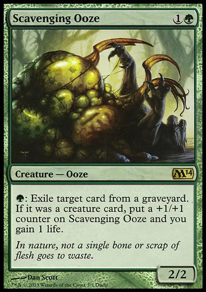 | Oracle Text | {G}: Exile target card from a graveyard. If it was a creature card, put a +1/+1 counter on Scavenging Ooze and you gain 1 life. | ||