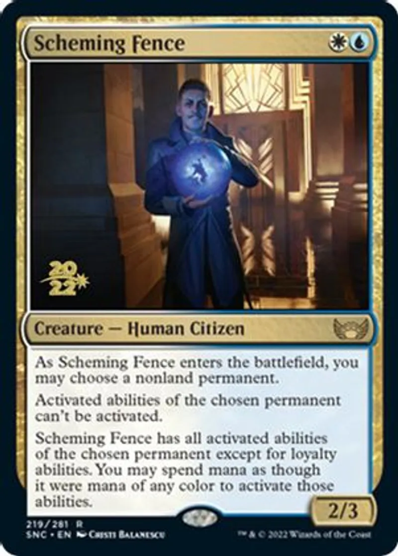 Scheming Fence has all activated abilities of the chosen permanent except for loyalty abilities. You may spend mana as though it were mana of any color to activate those abilities. | ||