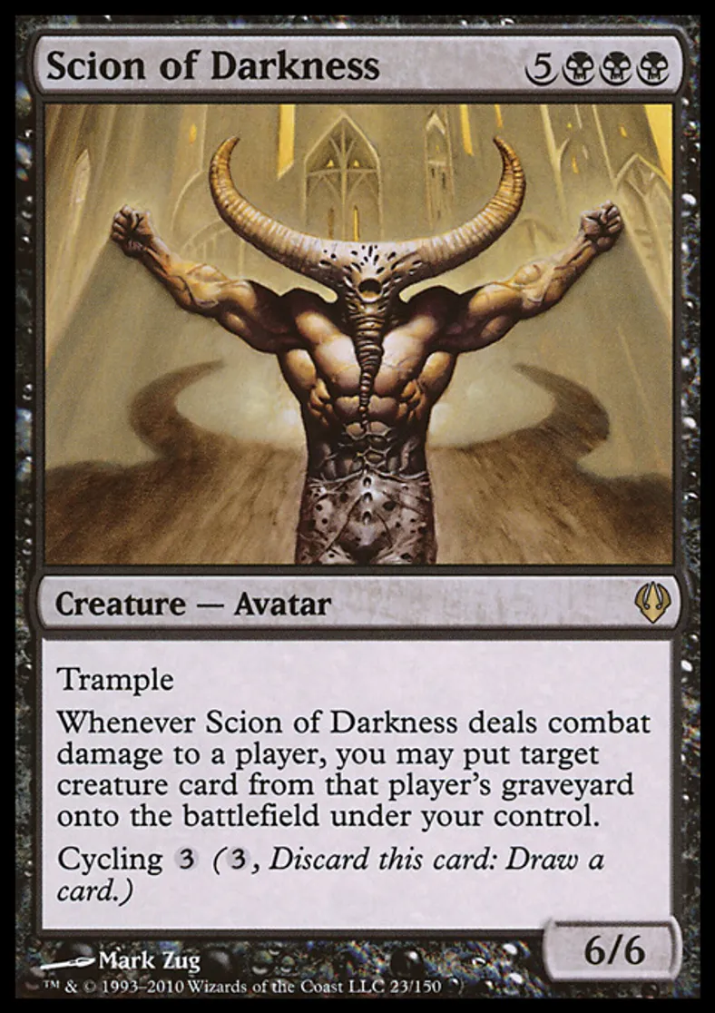 | Oracle Text | Trample Whenever Scion of Darkness deals combat damage to a player, you may put target creature card from that player's graveyard onto the battlefield under your control. Cycling {{3}} ({{3}}, Discard this card: Draw a card.) | ||