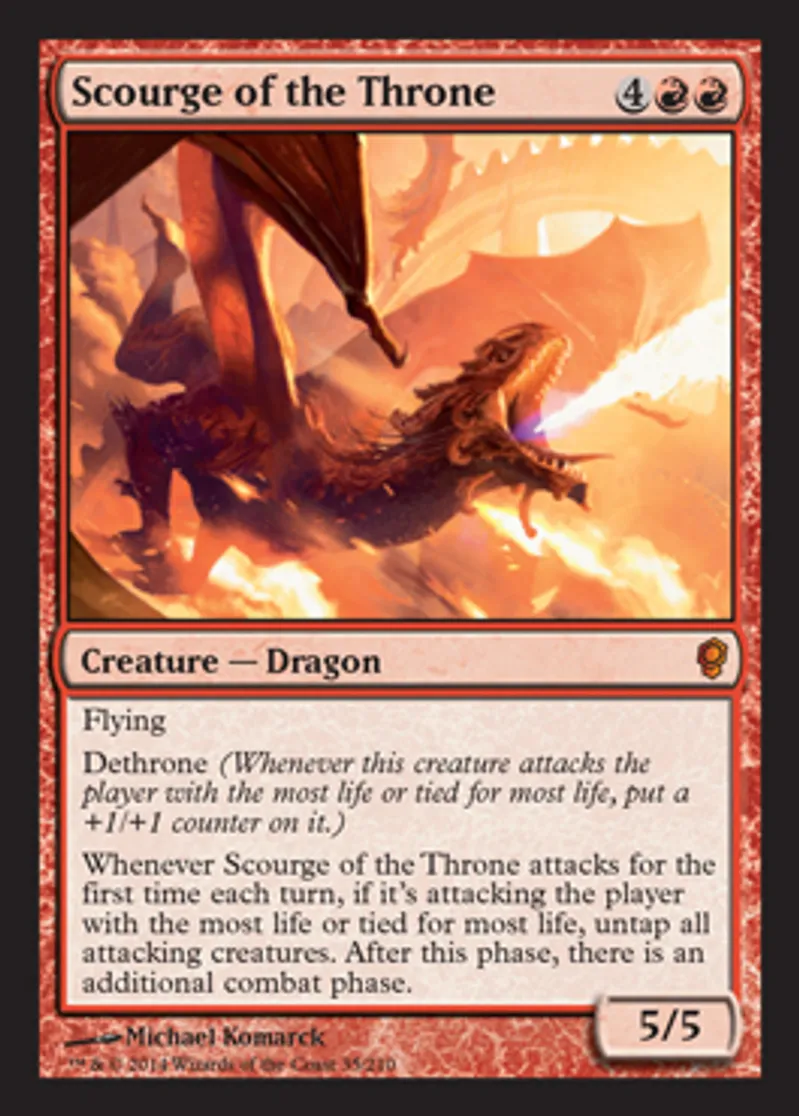 | Oracle Text | Flying Dethrone (Whenever this creature attacks the player with the most life or tied for most life, put a +1/+1 counter on it.) Whenever Scourge of the Throne attacks for the first time each turn, if it's attacking the player with the most life or tied for most life, untap all attacking creatures. After this phase, there is an additional combat phase. | ||