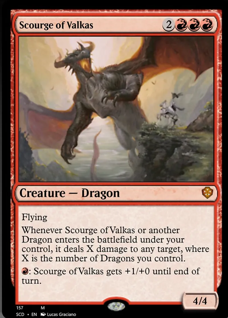 Magic: the Gathering (mtg) mythic Creature — Dragon Scourge of Valkas from Starter Commander Decks (scd) last updated 2026-02-23 14:26:32