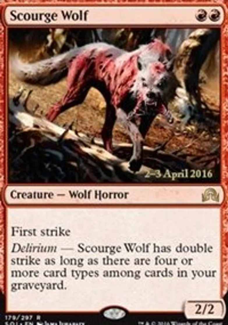 Delirium — Scourge Wolf has double strike as long as there are four or more card types among cards in your graveyard. | ||