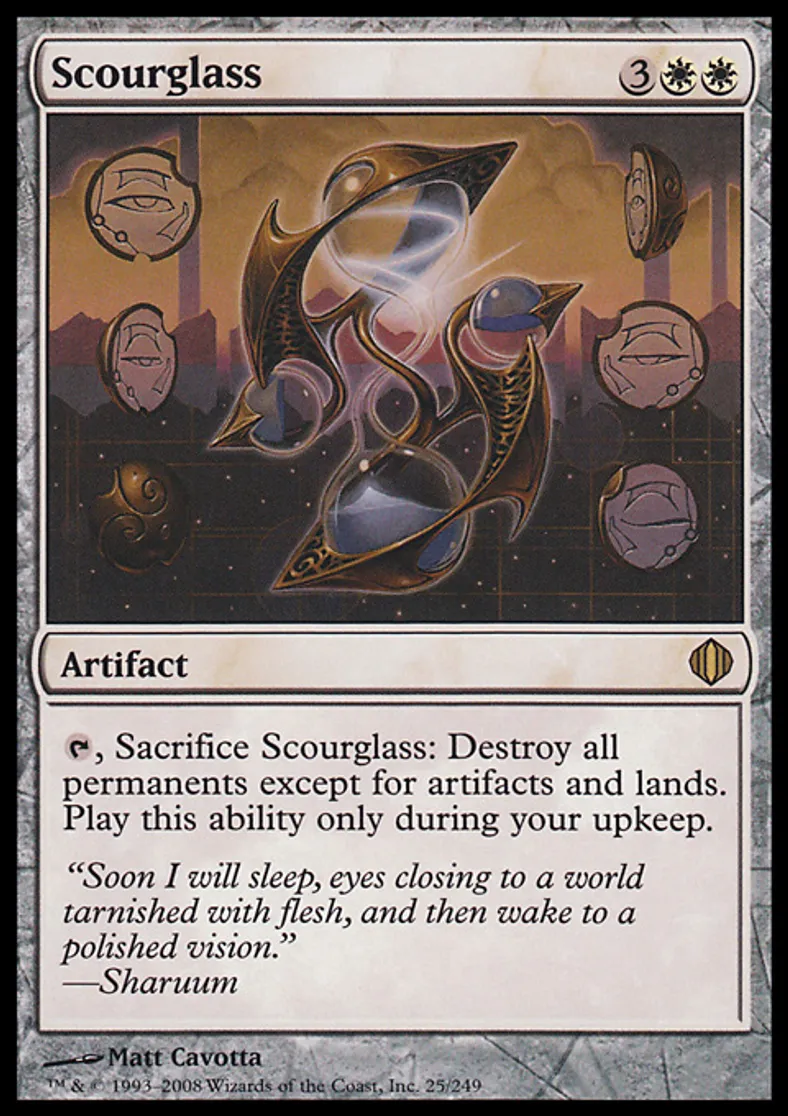 | Oracle Text | {{t}}, Sacrifice Scourglass: Destroy all permanents except for artifacts and lands. Activate this ability only during your upkeep. | ||