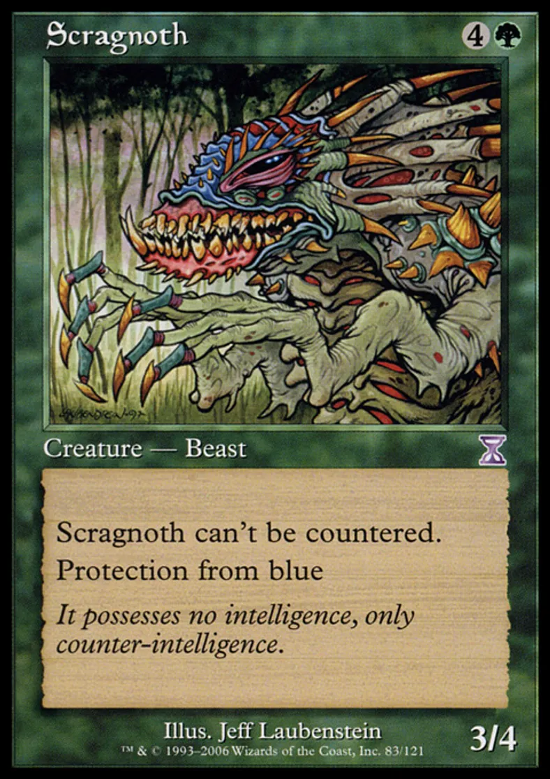 | Oracle Text | Scragnoth can't be countered. Protection from blue | ||