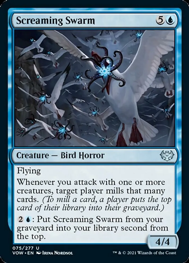 {2}{U}: Put Screaming Swarm from your graveyard into your library second from the top. | ||