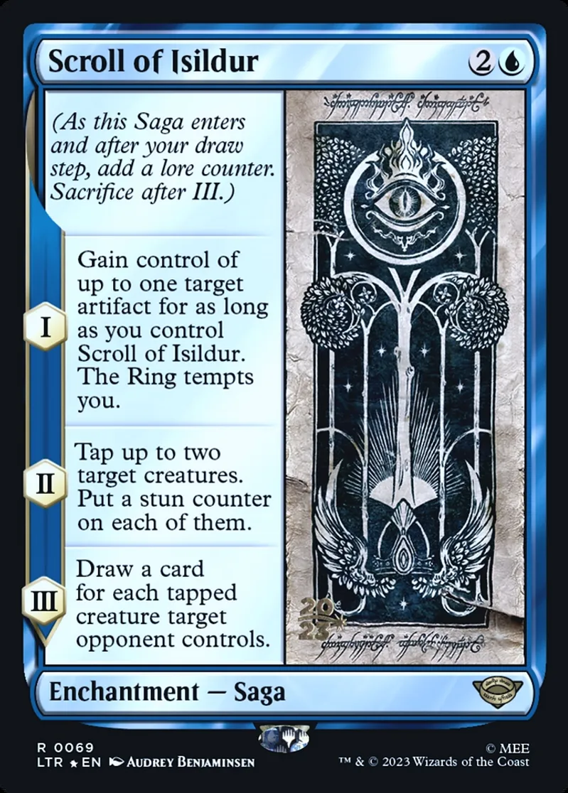 I — Gain control of up to one target artifact for as long as you control Scroll of Isildur. The Ring tempts you.