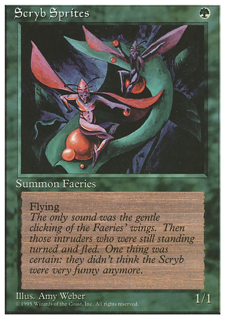 | Flavor Text | The only sound was the gentle clicking of the Faeries' wings. Then those intruders who were still standing turned and fled. One thing was certain: they didn't think the Scryb were very funny anymore. | ||