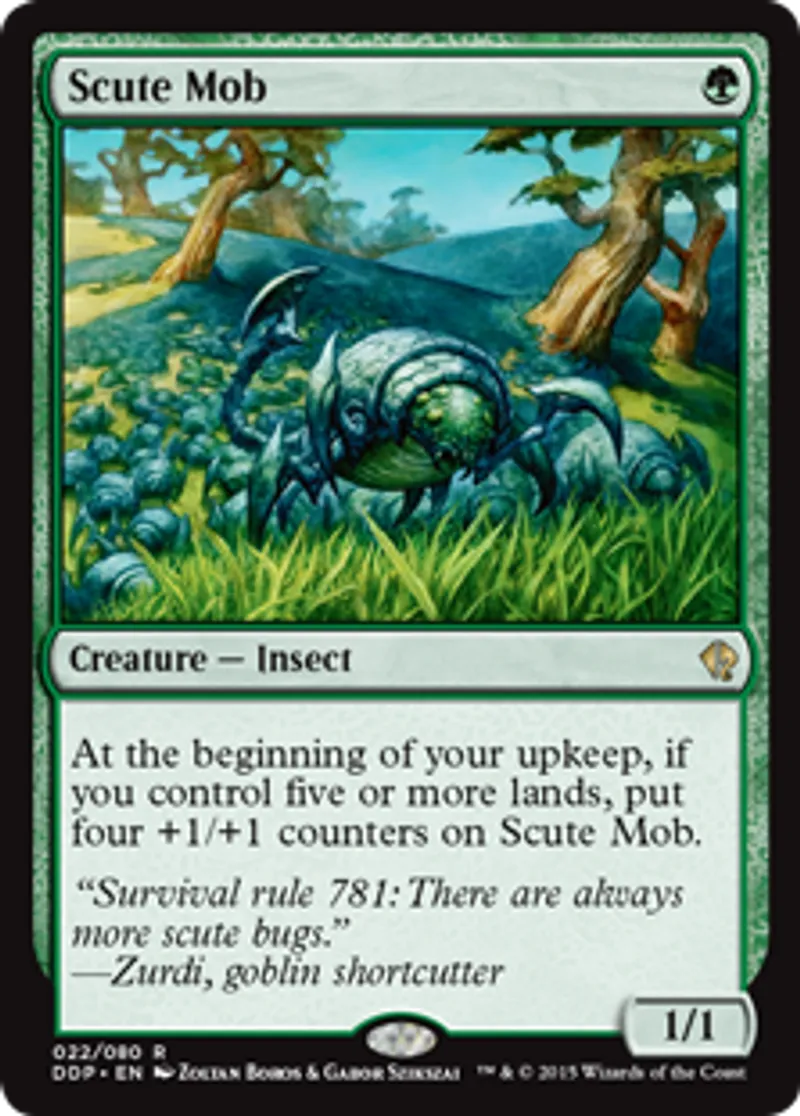 | Oracle Text | At the beginning of your upkeep, if you control five or more lands, put four +1/+1 counters on Scute Mob. | ||