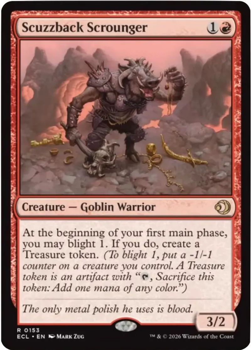 Magic: the Gathering (mtg) Rare creature — goblin warrior Scuzzback Scrounger from Lorwyn Eclipsed (ECL) last updated 2026-01-11 16:21:01