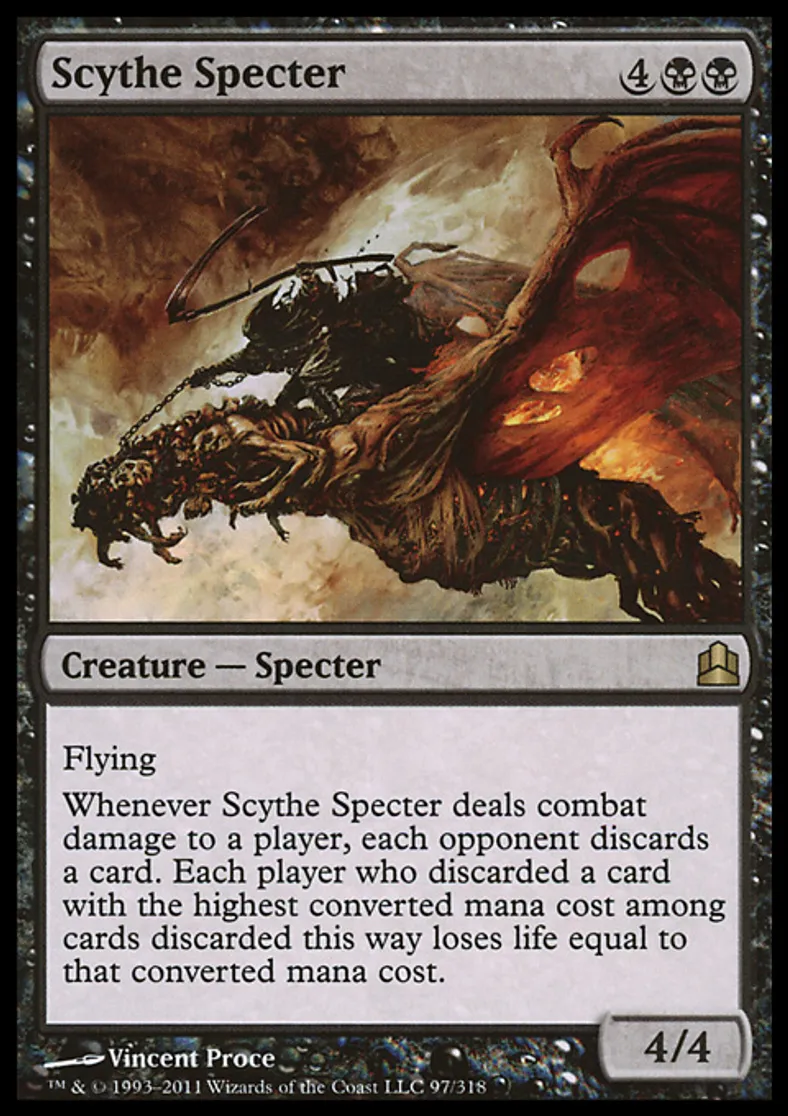 | Oracle Text | Flying Whenever Scythe Specter deals combat damage to a player, each opponent discards a card. Each player who discarded a card with the highest converted mana cost among cards discarded this way loses life equal to that converted mana cost. | ||