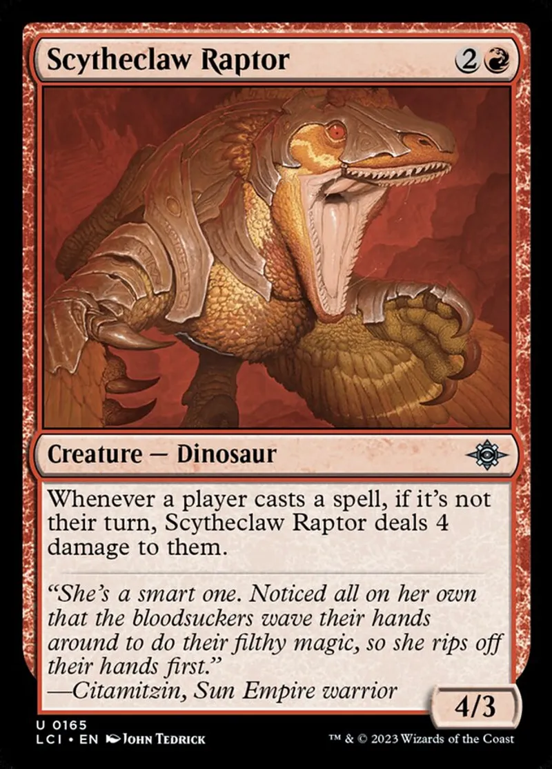 | Oracle Text | Whenever a player casts a spell, if it's not their turn, Scytheclaw Raptor deals 4 damage to them. | ||